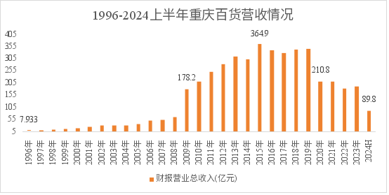 上市后資本市場(chǎng)開拓階段(1996-2016年):1996年,重慶百貨于上交所成功掛牌上市,當(dāng)年?duì)I業(yè)收入為7.93億元,在一系列市場(chǎng)化重組的操作下,2016年整體營(yíng)收達(dá)到頂峰:由2014年的301億元增長(zhǎng)到2015年的364.9億元(2015年財(cái)報(bào)數(shù)據(jù)修正,并入整合企業(yè))。