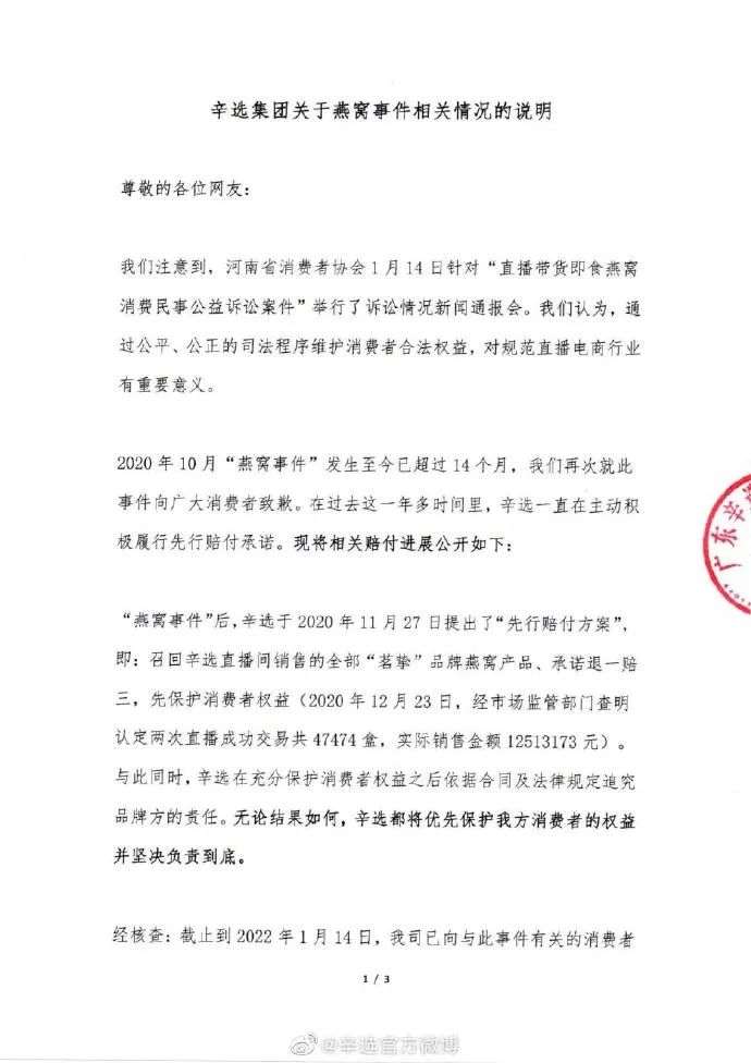 事后廣州市場(chǎng)監(jiān)管部門(mén)對(duì)辛巴團(tuán)隊(duì)以及燕窩商家做出了責(zé)令其停止違法行為并罰款90萬(wàn)元的行政處罰,河南省消費(fèi)者協(xié)會(huì)也針對(duì)辛巴直播帶貨即食燕窩消費(fèi)事件提起民事公益訴訟,提出退還即食燕窩產(chǎn)品銷(xiāo)售總價(jià)款人民幣1992.8539萬(wàn)元,并處以銷(xiāo)售總價(jià)款3倍的懲罰性賠款共計(jì)人民幣5978.5617萬(wàn)元,退賠金額總計(jì)人民幣7971.4156萬(wàn)元的訴求。