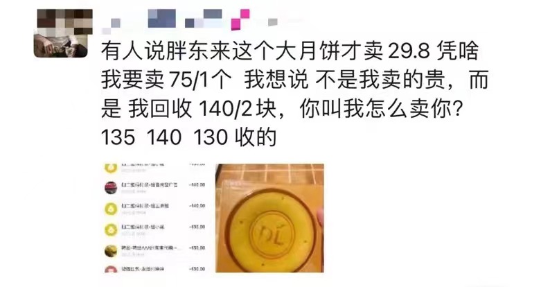 而針對(duì)月餅代購(gòu)價(jià)格高這一情況,有黃牛表示,“不是我賣(mài)的貴,而是我回收140/2塊,你叫我怎么賣(mài)你”。
