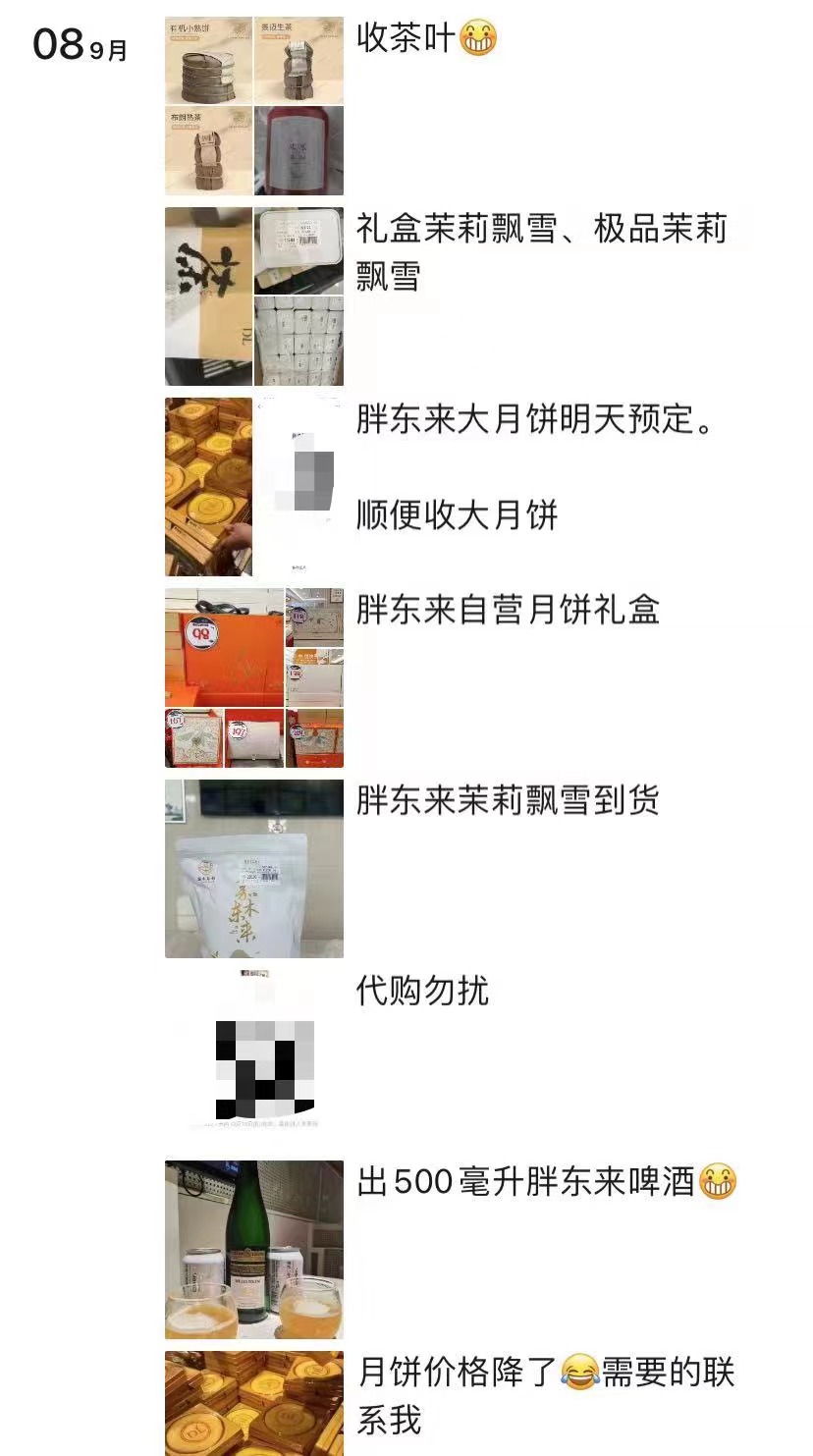 從某黃牛發(fā)布的朋友圈內(nèi)容可見(jiàn),除網(wǎng)紅大月餅外,胖東來(lái)多件自營(yíng)產(chǎn)品均在互聯(lián)網(wǎng)平臺(tái)被高價(jià)出售,涉及DL啤酒、茶葉、銀飾、手串等。該黃牛還在朋友圈表示,“只要價(jià)錢(qián)合理,月餅不是事”。