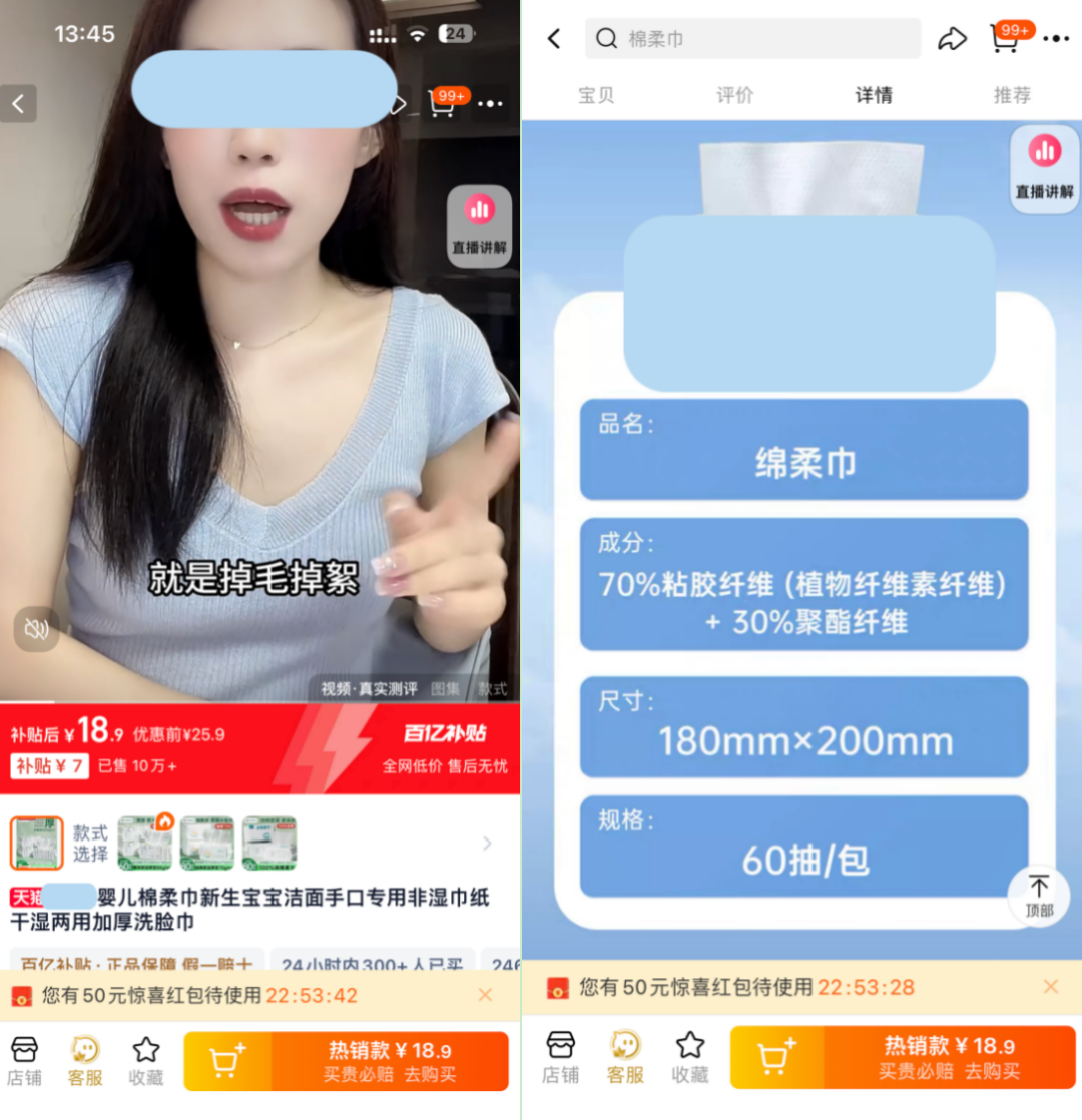 舉例說明,淘寶上搜索“棉柔巾”時,筆者發(fā)現(xiàn)竟然還有月銷量幾萬的品牌在“以綿充棉”,給自家的商品名稱標注“棉柔巾”吸引消費者下單,只有當用戶不斷下拉至商品詳情頁的最底端,才能發(fā)現(xiàn)這類產(chǎn)品的“廬山真面目”其實棉柔巾。