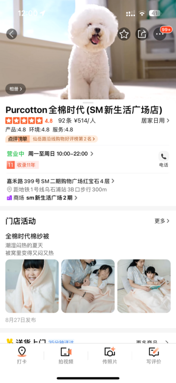 筆者嘗試定位廈門市,搜索“全棉時代”,發(fā)現(xiàn)其門店人均消費從100-500元不等,其中SM新生活廣場店,人均高達514元/人。