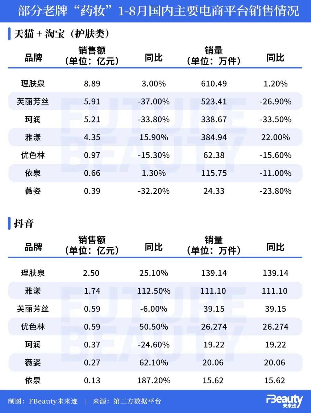 《FBeauty未來跡》在第三方數(shù)據(jù)平臺檢索發(fā)現(xiàn),在今年1-8月,理膚泉、芙麗芳絲、珂潤、雅漾、優(yōu)色林、依泉、薇姿這7個品牌在天貓+淘寶、抖音渠道共實現(xiàn)了32.57億元的銷售額。