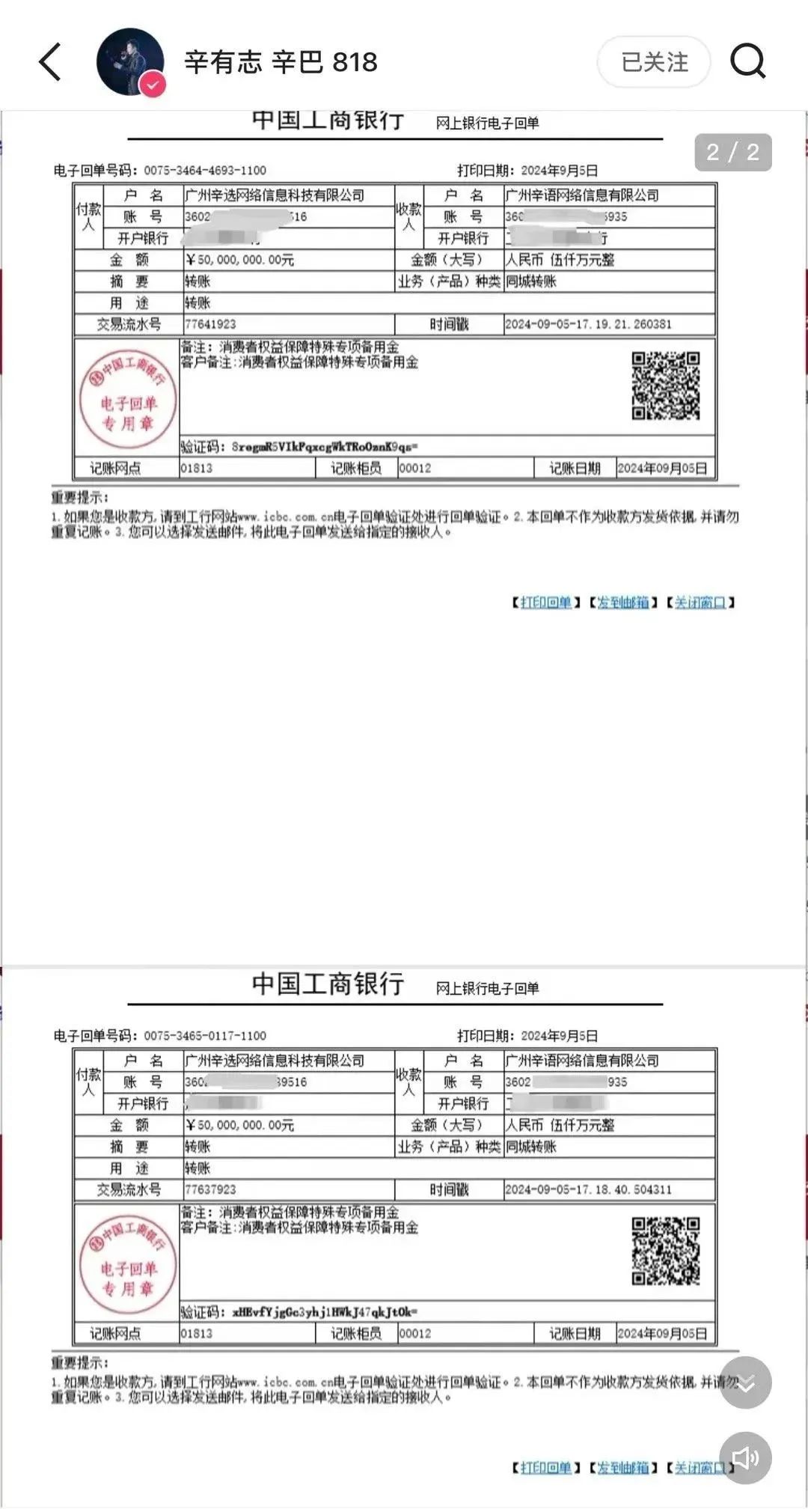 9月5日,辛巴曬出轉(zhuǎn)賬1億元的網(wǎng)銀電子回單截圖,將此次“互撕”再次推向高潮。據(jù)他表示,如果三只羊不對(duì)消費(fèi)者進(jìn)行賠付,辛選將替三只羊賠付消費(fèi)者。