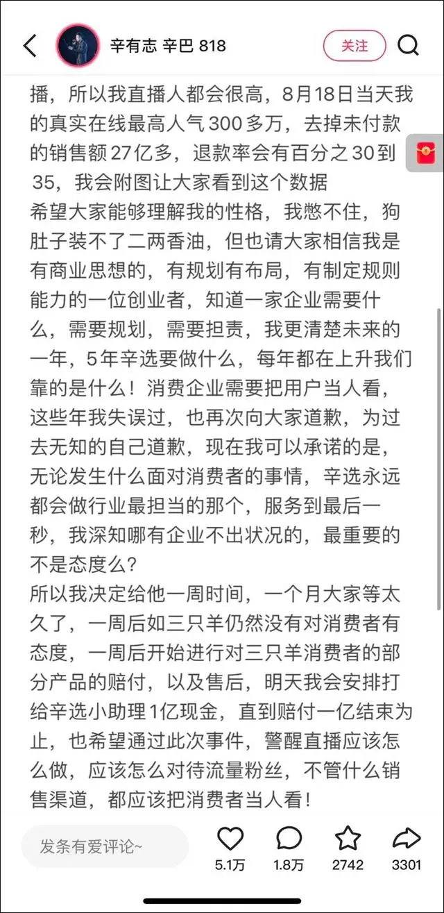 9月3日,盧文慶關(guān)閉了社交賬號(hào)內(nèi)容,小楊哥僅在直播當(dāng)天表示“好企業(yè)哪有天天吵架的,請(qǐng)靜觀其變。”對(duì)于辛巴此前提出的梅菜扣肉等產(chǎn)品質(zhì)量和售后問題,盧文慶于4日回應(yīng)稱“事件發(fā)生后,調(diào)查結(jié)果出來前,公司積極應(yīng)對(duì)做出了退款處理,包括但不僅限于退一賠三,三只羊建立了300多人的售后團(tuán)隊(duì),保障客服數(shù)量回應(yīng)機(jī)制,盡量滿足客戶的訴求。”