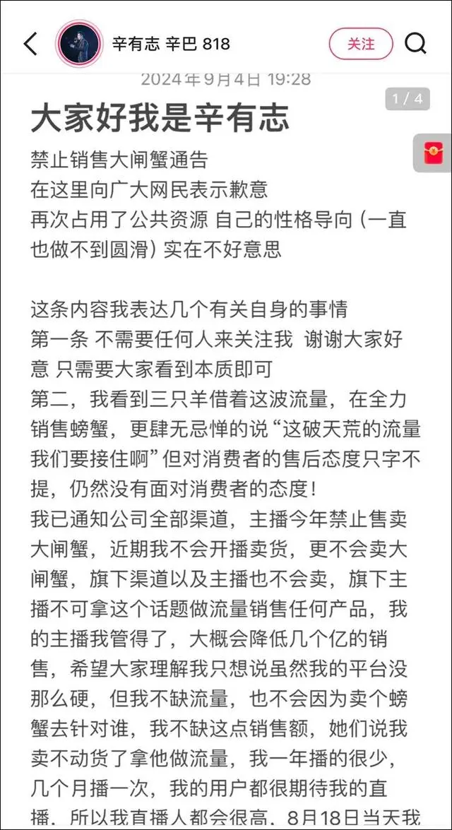 面對(duì)三只羊的回應(yīng),辛巴表現(xiàn)更為激進(jìn),9月4日晚也發(fā)文稱,“已通知公司全部渠道,主播今年禁止售賣大閘蟹。近期我不會(huì)開播賣貨,更不會(huì)賣大閘蟹,旗下渠道以及主播也不會(huì)賣,旗下主播不可拿這個(gè)話題做流量銷售任何產(chǎn)品!