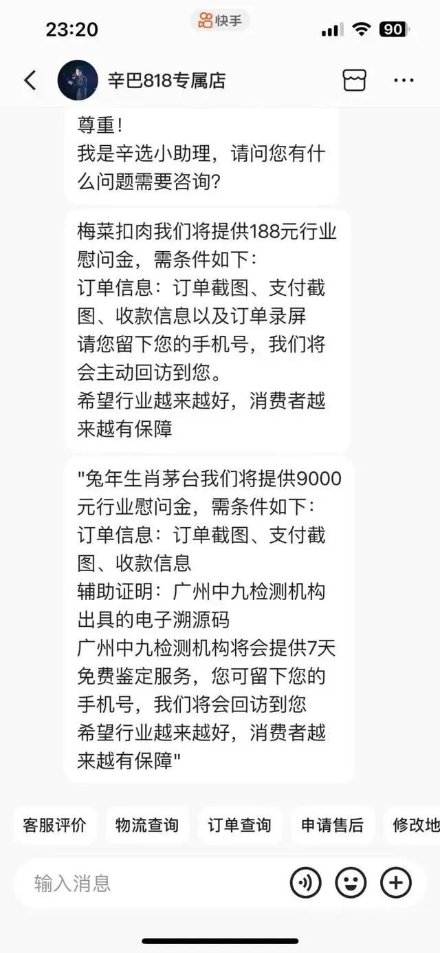 當(dāng)日晚10點(diǎn)多,有多名網(wǎng)友在辛巴賬號(hào)最新視頻的評(píng)論區(qū)中發(fā)布與辛選客服對(duì)話的截圖。截圖顯示,當(dāng)消費(fèi)者發(fā)送“梅菜扣肉”等關(guān)鍵詞后,辛選客服回復(fù)將提供“行業(yè)慰問金”。