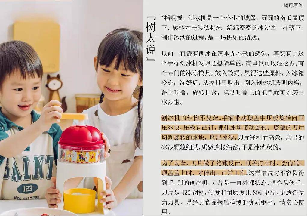 直到今天,打開樹可的店鋪首頁可以看到游園地圖,許多詳情頁的開頭是樹太對用戶的“嘮嗑”,里面講述了飯勺的內(nèi)外層材質(zhì)、噴油壺不掛油的霧化原理、刨冰機又做了哪些細節(jié)改造。