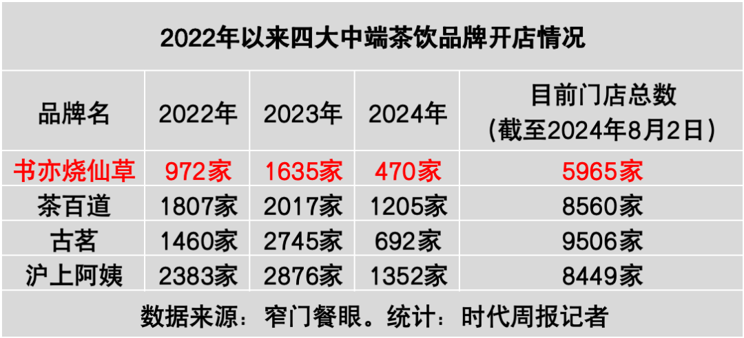 根據(jù)窄門餐眼,2022年、2023年、2024年至今,書亦燒仙草新開門店數(shù)量分別為972家、1635家與470家,同一時期,茶百道、古茗與滬上阿姨的新開門店數(shù)量均遠超書亦燒仙草。其不足6000家的門店體量相當于倒退到了2年前。