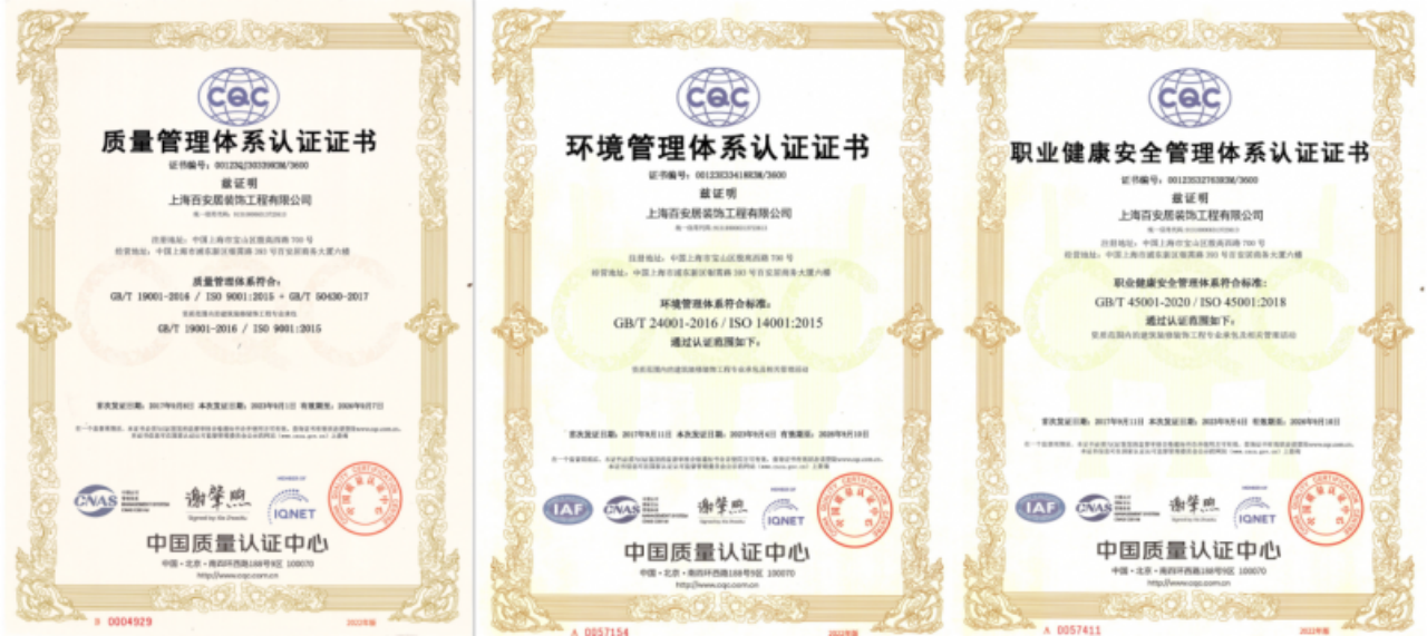 作為家裝家居行業(yè)先鋒,百安居自2017年起至今,已連續(xù)八年順利通過(guò)中國(guó)質(zhì)量認(rèn)證中心(CQC)嚴(yán)格審查,取得質(zhì)量管理體系(ISO9001)、環(huán)境管理體系(ISO14001)以及職業(yè)健康安全管理體系(ISO45001)認(rèn)證證書,并于2024年8月31日起接受CQC為期一周的新一輪體系監(jiān)督復(fù)審。