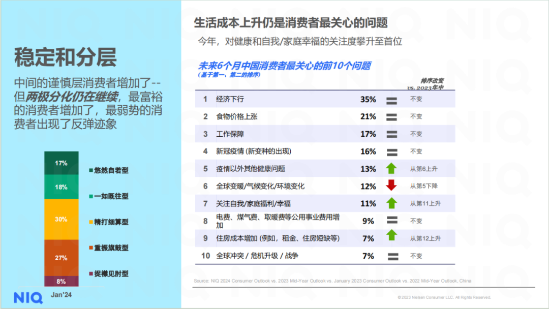 尼爾森《2024年中國消費者調(diào)研報告》顯示:當前的生活成本上升仍是消費者關(guān)心的問題,但隨著消費者將生存策略轉(zhuǎn)變?yōu)殚L期行為,韌性也在變化中不斷涌現(xiàn),他們對健康和自我/家庭幸福的關(guān)注度攀升至首位。