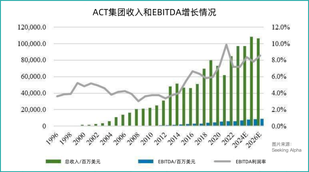 投資研究平臺Seeking Alpha數(shù)據(jù)顯示,ACT在過去十年里的收入和EBITDA復(fù)合年增長率分別為7.3%和14.5%,過去20年分別為18.4%和21.1%。由此可見,公司不僅成功整合收購,還隨著時間穩(wěn)步提高了利潤率。