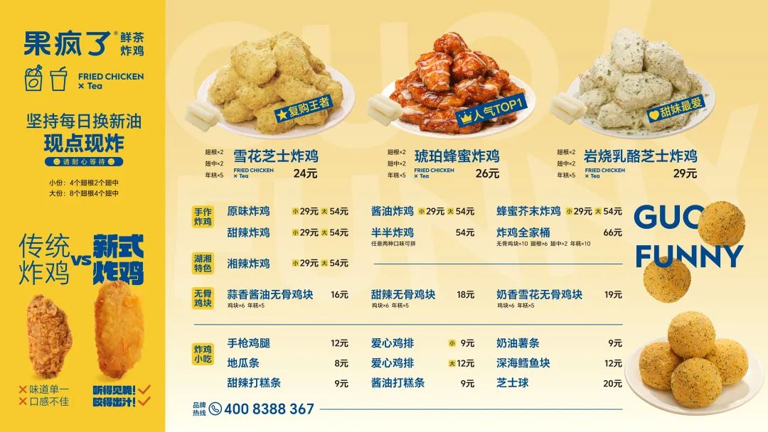 她把長沙萬家麗的門店作為實(shí)驗(yàn)店,改名為:果瘋了鮮茶炸雞,把炸雞和茶飲區(qū)域按照1:1的比例進(jìn)行了店型改造。
