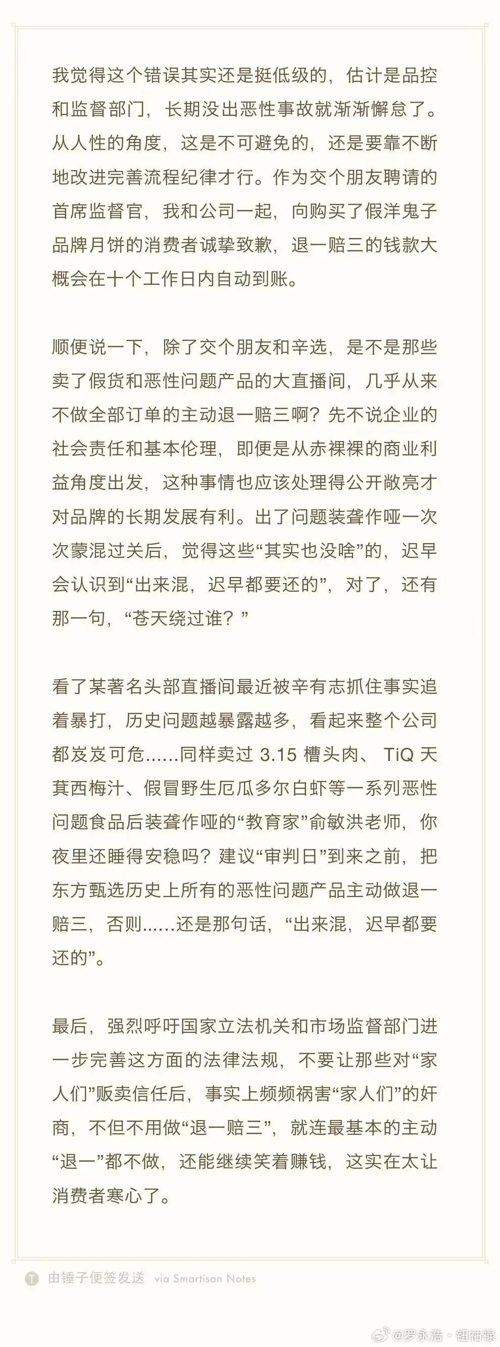 羅永浩借此機(jī)會(huì)呼吁行業(yè)自律,批評(píng)部分主播在出現(xiàn)假貨問(wèn)題后“裝聾作啞”,并點(diǎn)名俞敏洪。