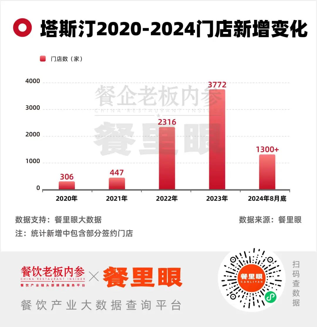 根據(jù)餐里眼數(shù)據(jù)顯示,進(jìn)入2024年,塔斯汀拓店速度明顯放緩。截至2024年8月底,塔斯汀新開門店數(shù)量約為1300家,其中包含部分已簽約門店,月均開店速度約為160家。而在2023年,塔斯汀全年新開門店數(shù)量高達(dá)3772家,月均開店速度突破300+家;2022年全年新開門店數(shù)量則為2316家,月均近200家。