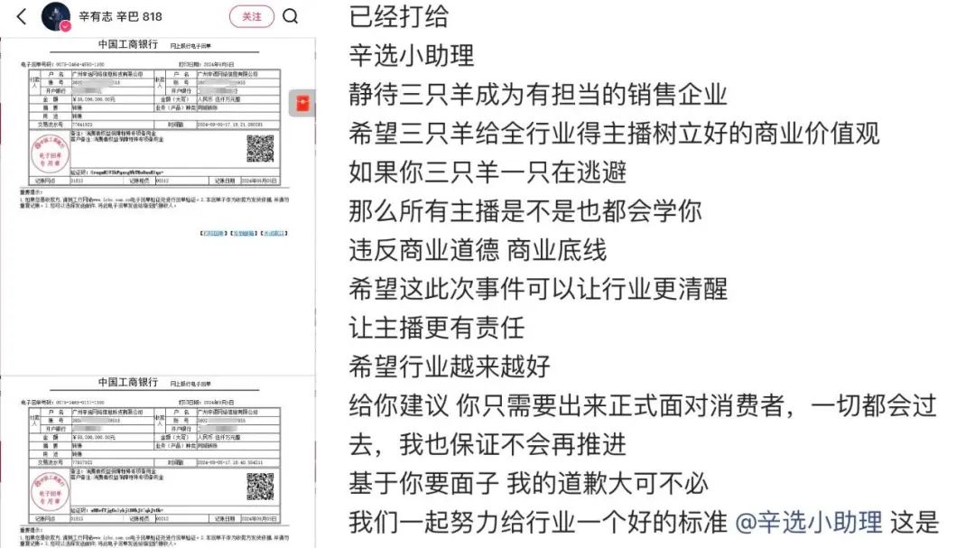 這波“土豪”操作,讓辛巴占據(jù)了輿論上風,卻也付出了直播權限被封禁的代價。不過即使被禁播了,辛巴的賠錢行動依舊高調進行,9月12日,陸續(xù)有網(wǎng)友曬出截圖,顯示已收到辛巴團隊以“行業(yè)慰問金”為名義的賠付款。