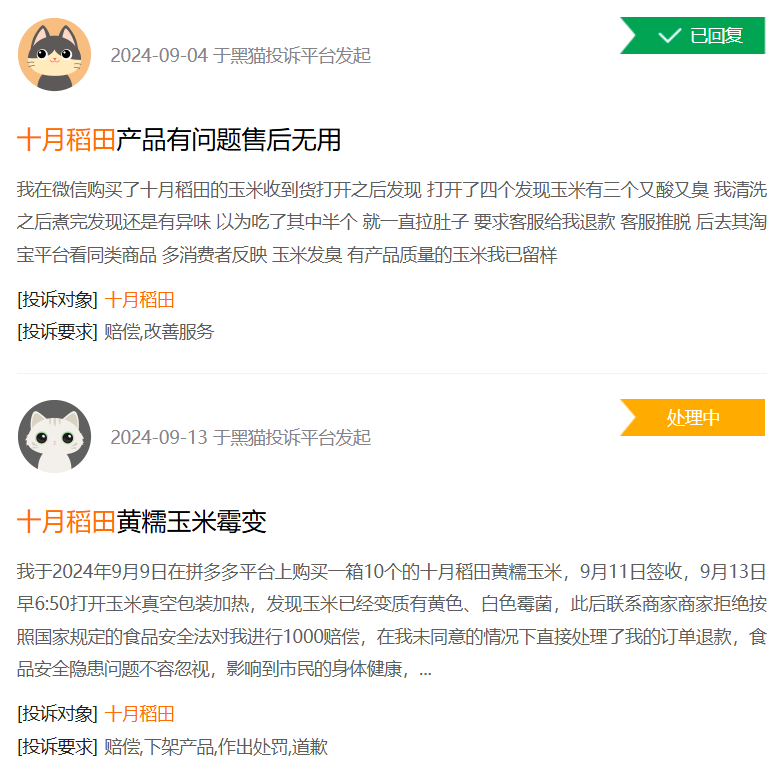 大肆營(yíng)銷(xiāo)對(duì)于食品企業(yè)所帶來(lái)的另一個(gè)負(fù)面作用,便在于食安問(wèn)題。黑貓投訴平臺(tái)上以“十月稻田”為關(guān)鍵詞進(jìn)行搜索,能夠看到250多條投訴,大多集中在產(chǎn)品變質(zhì)發(fā)霉、售后問(wèn)題無(wú)人解決等。