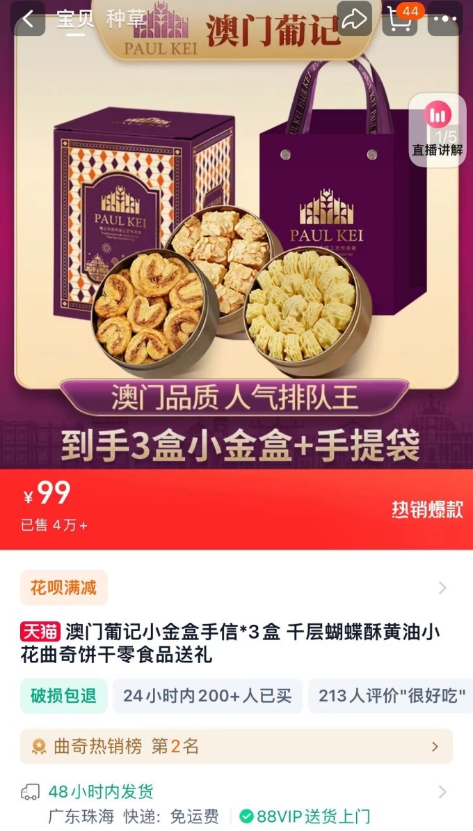 葡記淘寶旗艦店顯示,目前該店粉絲52.6萬,澳門葡記小金盒手信、葡記蛋黃酥、咸蛋黃味方塊酥銷量過萬,不過產(chǎn)品發(fā)貨地均為廣東珠海。葡記京東自營旗艦店粉絲數(shù)達(dá)29.1萬。不過,《聯(lián)商網(wǎng)》在這兩家店鋪中均未找到葡記月餅這一產(chǎn)品。