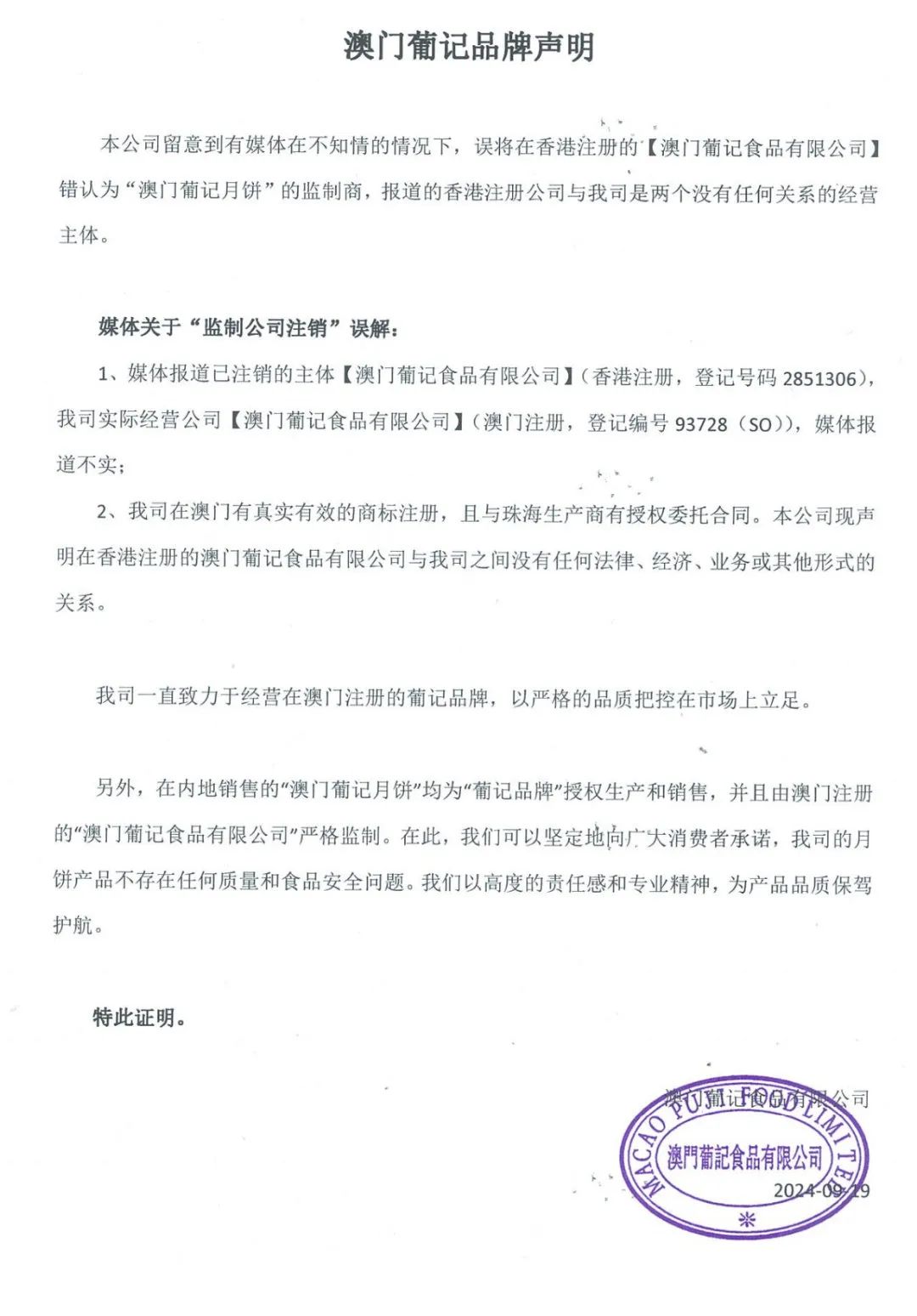 該公司表示:“有媒體在不知情的情況下,誤將在香港注冊的【澳門葡記食品有限公司】錯認(rèn)為‘澳門葡記月餅’的監(jiān)制商,報道的香港注冊公司與我司是兩個沒有任何關(guān)系的經(jīng)營主體。”