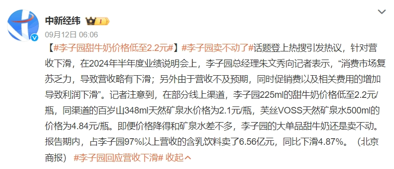 最近,在李子園2024年半年度業(yè)績(jī)說(shuō)明會(huì)上,對(duì)于報(bào)告期內(nèi)營(yíng)收下滑,李子園總經(jīng)理朱文秀解釋稱(chēng)受經(jīng)濟(jì)環(huán)境影響,消費(fèi)市場(chǎng)復(fù)蘇乏力。之后,#李子園賣(mài)不動(dòng)了#一度成為微博熱門(mén)話題,引發(fā)了諸多網(wǎng)友的討論。