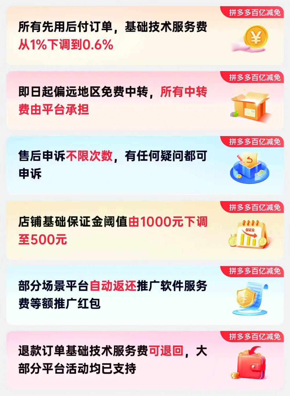 店鋪基礎(chǔ)保證金從1000元下調(diào)到500元、先用后付訂單的技術(shù)服務(wù)費全部由1%降至0.6%、偏遠(yuǎn)地區(qū)物流中轉(zhuǎn)費用由平臺承擔(dān)……每一筆對于商家來說都是不小的成本縮減。