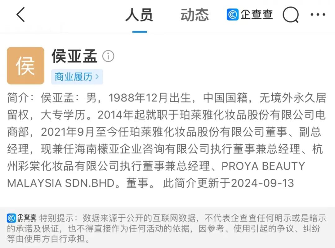 根據(jù)企查查顯示,侯亞孟還在海南檬亞企業(yè)咨詢(xún)有限公司擔(dān)任執(zhí)行董事兼總經(jīng)理、在杭州彩棠化妝品有限公司擔(dān)任執(zhí)行董事兼總經(jīng)理、在PROYA BEAUTY MALAYSIA SDN. BHD.擔(dān)任董事。
