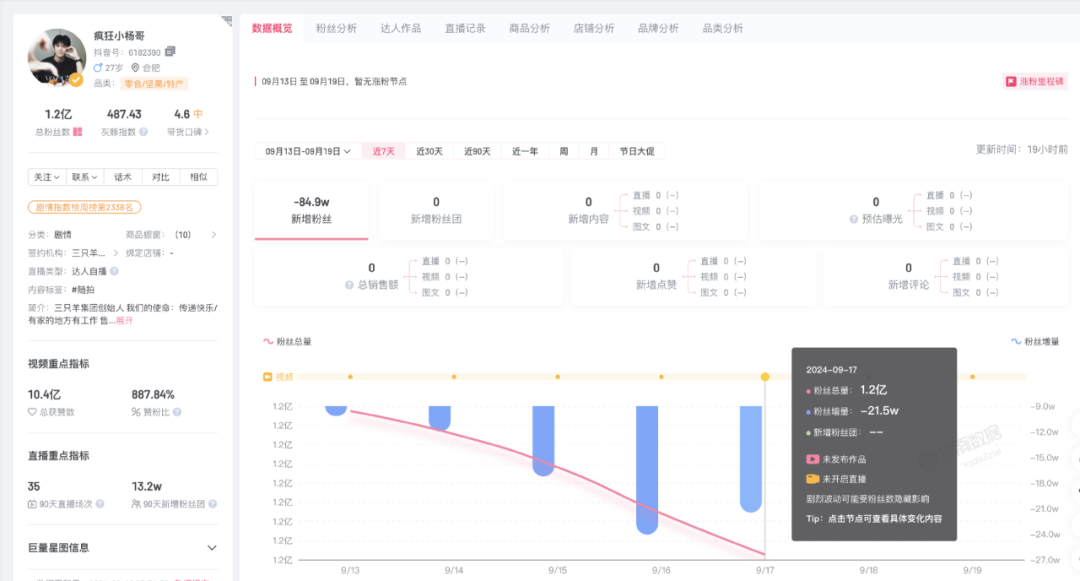 據(jù)灰豚數(shù)據(jù)統(tǒng)計,截至9月17日的一周內(nèi),瘋狂小楊哥賬號粉絲減少了超過80萬,30天內(nèi)掉粉接近300萬,9月18日,瘋狂小楊哥賬號粉絲量跌落一億,三只羊網(wǎng)絡(luò)粉絲為1134.8萬。
