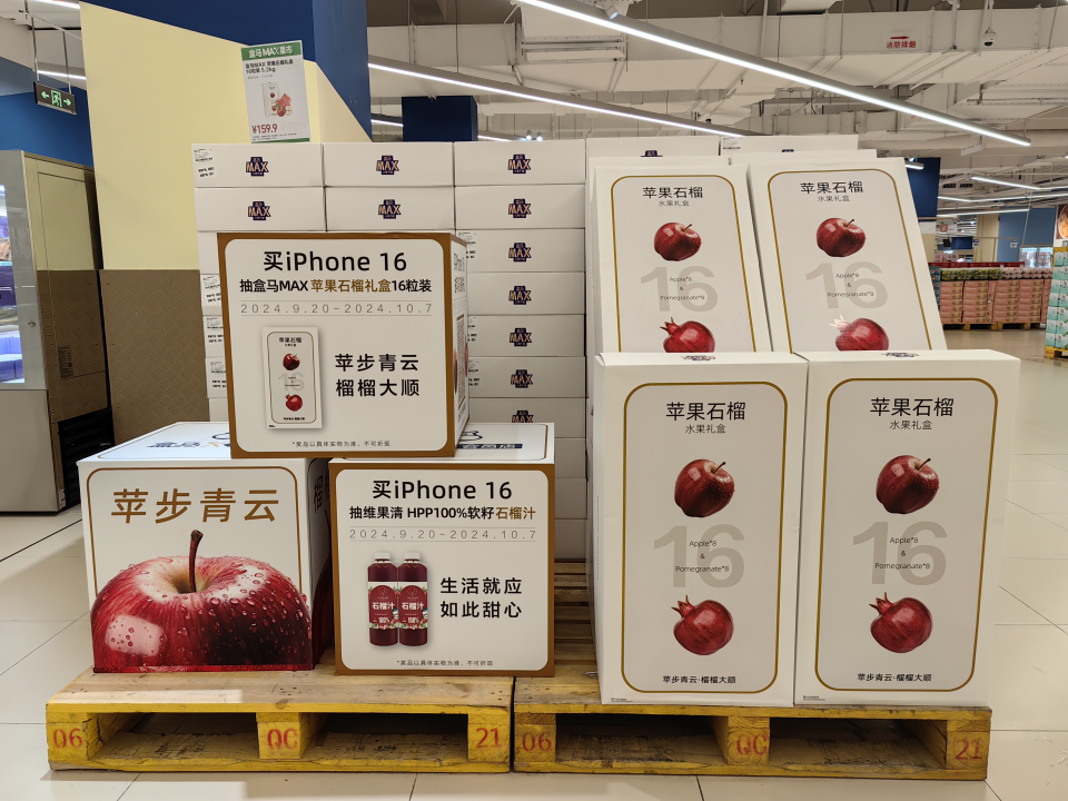 此前,蘋果9月10日舉辦iPhone 16新品發(fā)布會(huì),盒馬于同日召開的“蘋果石榴發(fā)布會(huì)”吸引不少網(wǎng)友圍觀。除了發(fā)布會(huì)上官宣“斷貨王”紅心蘋果汁即將回歸、石榴云霧綠茶銷量破300萬瓶等,iPhone 16系列現(xiàn)貨將在盒馬X會(huì)員店同步開售的消息也讓不少“果粉”開始期待。