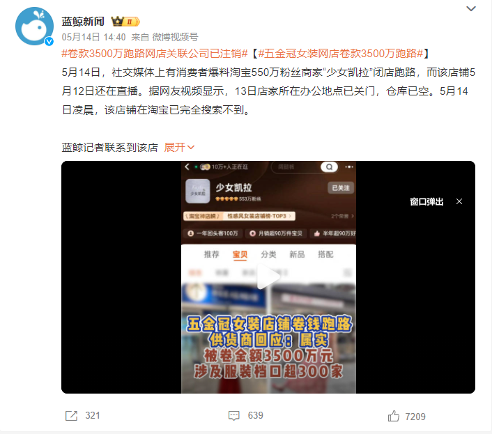 不僅是張大奕的店鋪,今年以來,多家知名線上女裝店鋪都選擇閉店。前段時(shí)間,擁有50多萬粉絲的8年老店“沉入深藍(lán) LOSVLUE”宣布閉店。與此同時(shí),40多萬粉絲的女裝店“The Bubble”也發(fā)布了閉店通知,表示將開始清倉。更早之前,“蘇菜蘿卜Studio”、“復(fù)古大爆炸”等都宣布閉店或停止上新。今年5月,擁有500多萬粉絲的“5金冠”店鋪“少女凱拉”,被曝出拖欠200多家商家的貨款,總金額超過3000萬元。抖音上,粉絲數(shù)量達(dá)到500萬的頭部女裝店“羅拉密碼”,也在618前宣布停播、閉店。
