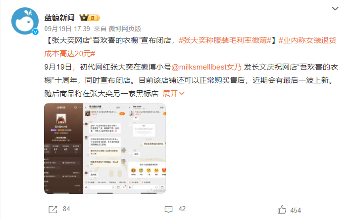 其在小號(hào)“milksmelllbest女乃”上宣布,將無限期延遲名下吾歡喜的衣櫥、裙子君、Jupevendue三家店鋪上新,算是關(guān)店。