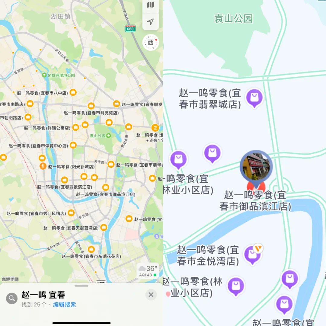 蘋果手機地圖顯示,宜春至少有超過25家趙一鳴門店。