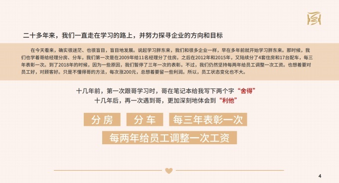 之后在2012年和2015年,又陸續(xù)分了4套住房和17臺配車,每三年表彰一次。到了2018年的時候,因為一些原因,我們暫停了三年一次的表彰。不過,我們?nèi)匀粓猿置績赡杲o員工調(diào)整一次工資。也想著要對員工好,對顧客好。只是不懂得東來哥的方法,每次漲200元,總想著給要留一些利潤。所以,員工狀態(tài)變化也不大。