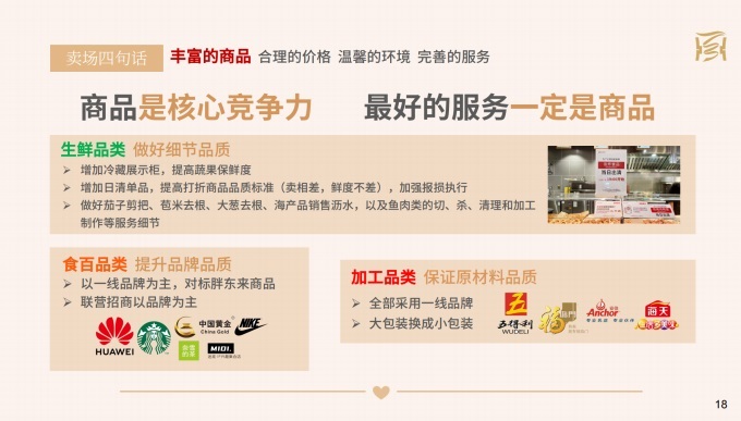 在淘汰三四線品牌商品,包括這次胖東來商品的對標。我們從業(yè)務(wù)團隊到營運團隊特別擔心商品品質(zhì)好了,價格和過去有差距,會不會讓顧客感覺我們的商品貴了,影響銷售,而且還砍掉了很多原來的雙A商品。所以,總是猶豫不絕。這個時候,老板的決心非常重要。就要告訴大家先不要想,先堅決地調(diào)整。然后,和大家共同想辦法,商品調(diào)整之后,經(jīng)營思路也要跟著調(diào)整。比如,我們要做好賣場商品功能性介紹,不管是用小黑板、還是通過提升員工專業(yè)性,讓顧客了解我們商品品質(zhì)的提升。讓我們來幫助顧客選擇,幫助顧客提升生活的品質(zhì)。這才是我們真正應(yīng)該做的。