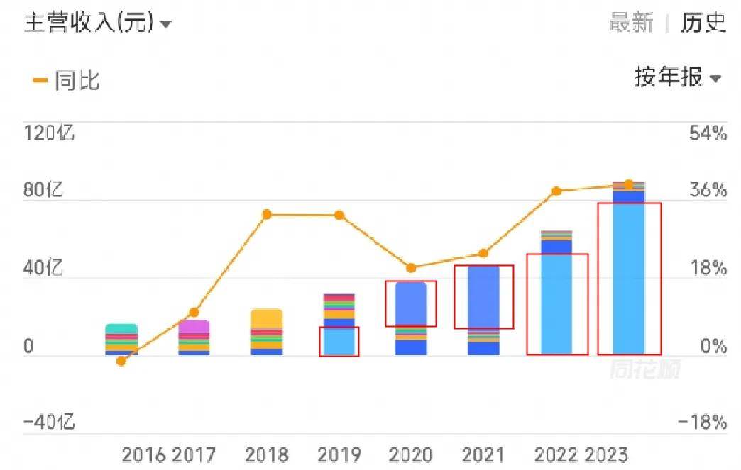 圖源:“同花順”,紅框內(nèi)為珀萊雅線上收入,柱狀圖為總收入