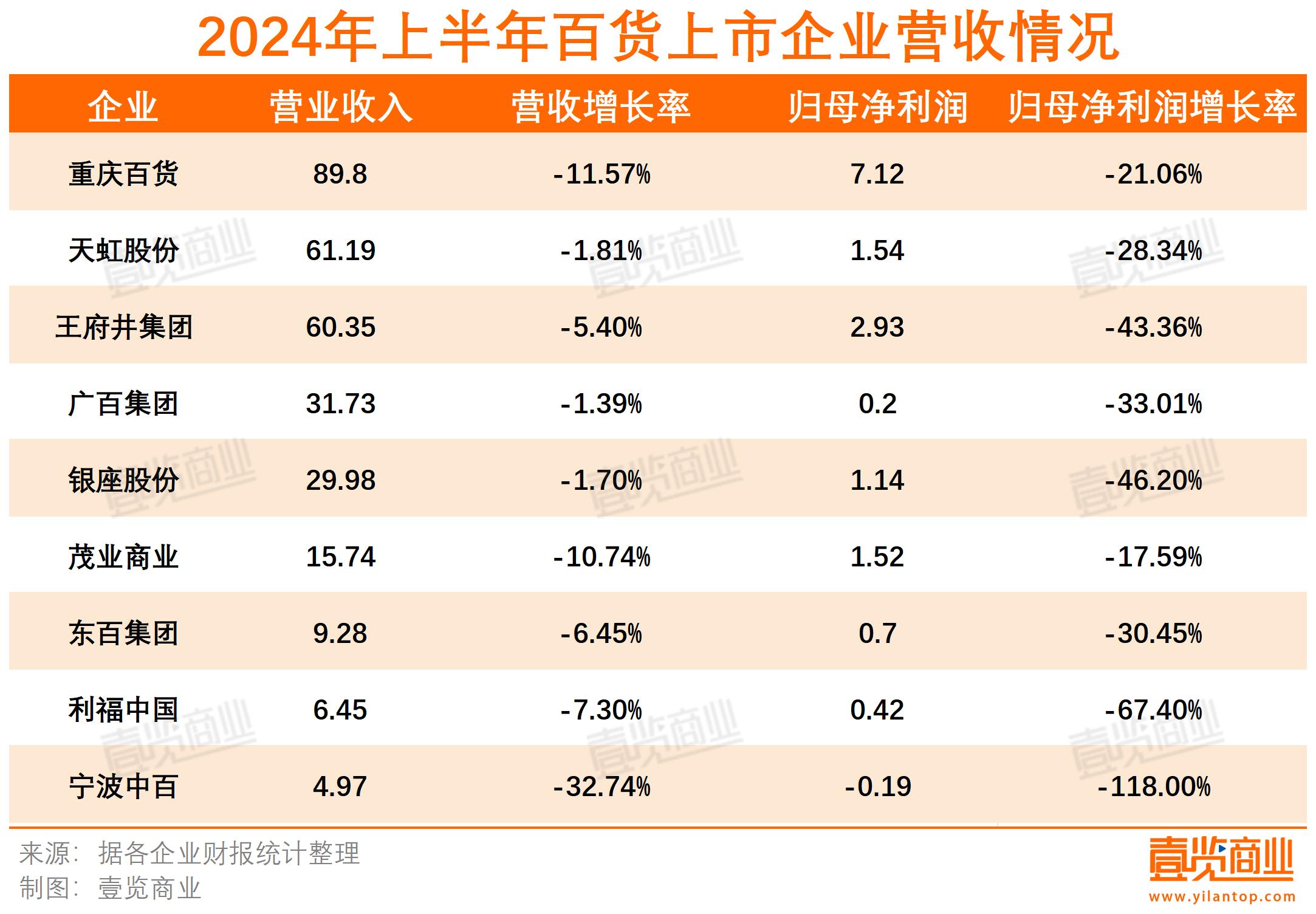 環(huán)境的變化影響著每一位參與者,一是體現(xiàn)在企業(yè)的營(yíng)收上。今年上半年,14家百貨上市企業(yè)中,僅有中央商場(chǎng)實(shí)現(xiàn)營(yíng)收、凈利雙增長(zhǎng),重慶百貨、天虹股份、王府井集團(tuán)等9家企業(yè)營(yíng)收凈利雙雙下降,其中重慶百貨、茂業(yè)商業(yè)、寧波中百雙位數(shù)下降,寧波中百營(yíng)收下降最大達(dá)到32.74%,凈利潤(rùn)更是下滑118%,由盈轉(zhuǎn)虧。