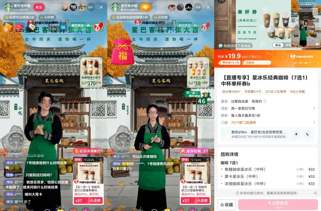 劇里主角提到的“39.9文兩杯”、“第二杯星巴客棧請(qǐng)”等優(yōu)惠活動(dòng),正和星巴克中國(guó)直播間所主打的優(yōu)惠一致;官方直播間的裝扮也呼應(yīng)了劇內(nèi)風(fēng)格,以星巴客棧為背景,主播穿上劇中主角同款服飾,售賣短劇同款飲品,比如火晶柿子星冰樂(lè)、柚子鐵觀音茶拿鐵、板栗紅豆沙,秒殺價(jià)19.9,焦糖瑪奇朵(燕麥/焦糖/金烘焦糖)37塊錢買一送一,直播間里所售賣的產(chǎn)品折扣低至4.9折。