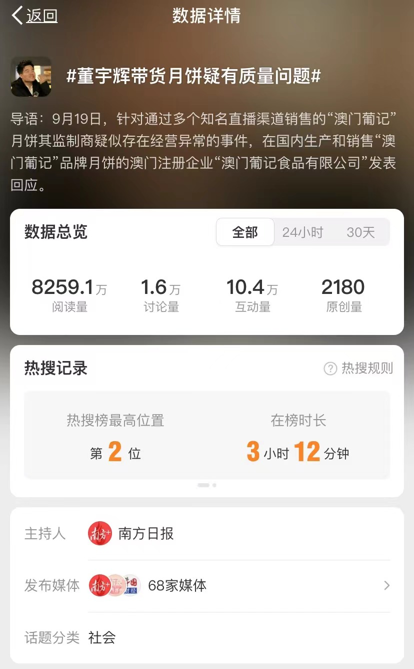 當(dāng)然,除此之外,近日與輝同行的品控問題也飽受爭(zhēng)議。有媒體報(bào)道稱,于與輝同行直播間售賣的“澳門葡記”月餅監(jiān)制商疑似經(jīng)營(yíng)異常。盡管澳門葡記食品有限公司表示,媒體誤將香港注冊(cè)的“澳門葡記食品有限公司”錯(cuò)認(rèn)為“澳門葡記月餅”的監(jiān)制商。公司在澳門有真實(shí)有效的商標(biāo)注冊(cè),且與珠海生產(chǎn)商有授權(quán)委托合同。但此事仍在不斷發(fā)酵。