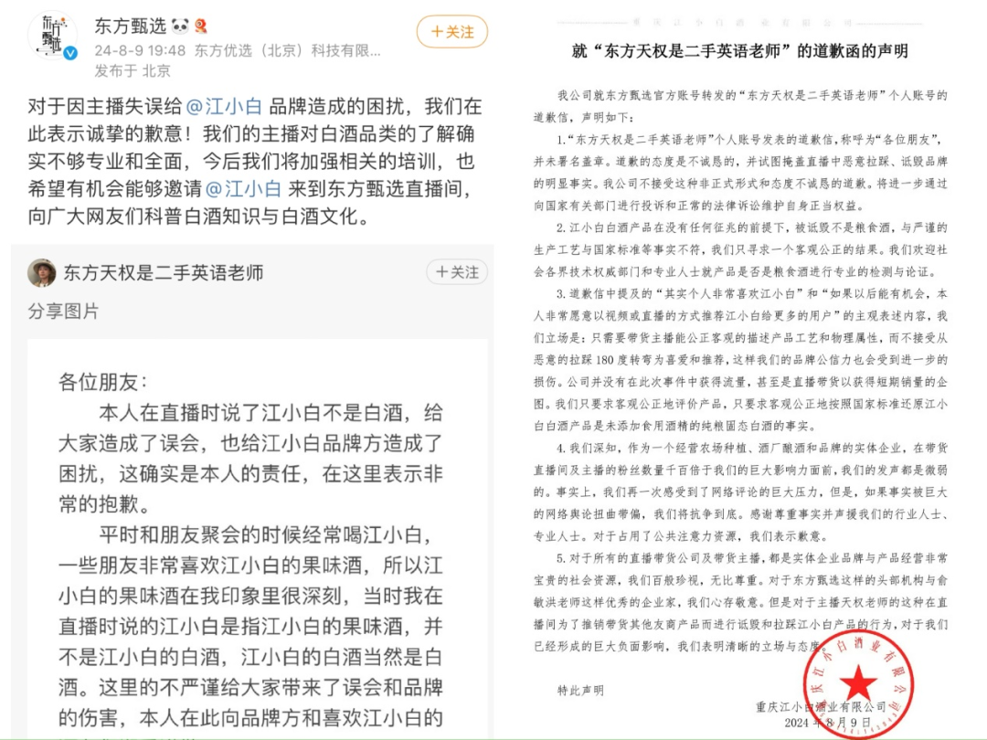 很快,東方甄選主播天權(quán)發(fā)布道歉信,稱其在直播時(shí)說了江小白不是白酒,給大家造成了誤會(huì),也給江小白品牌方造成了困擾,隨后,東方甄選官方微博也發(fā)文表達(dá)歉意。