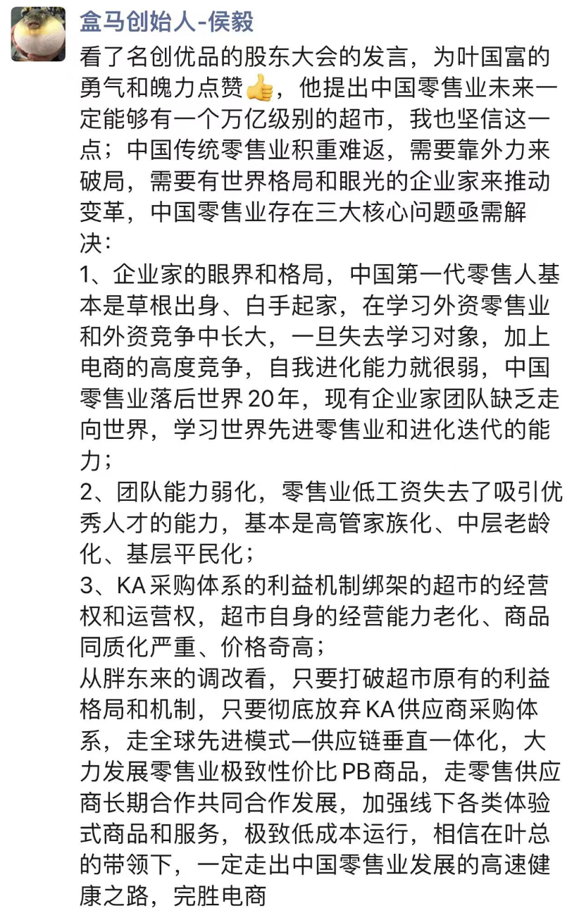 葉國富認為,在走遍全球,看遍全球零售業(yè)態(tài)后,仍認為更優(yōu)秀的零售模式在中國,即胖東來模式,它是中國超市唯一的出路。早在七月底,葉國富就曾在朋友圈中對胖東來模式給予高度肯定。