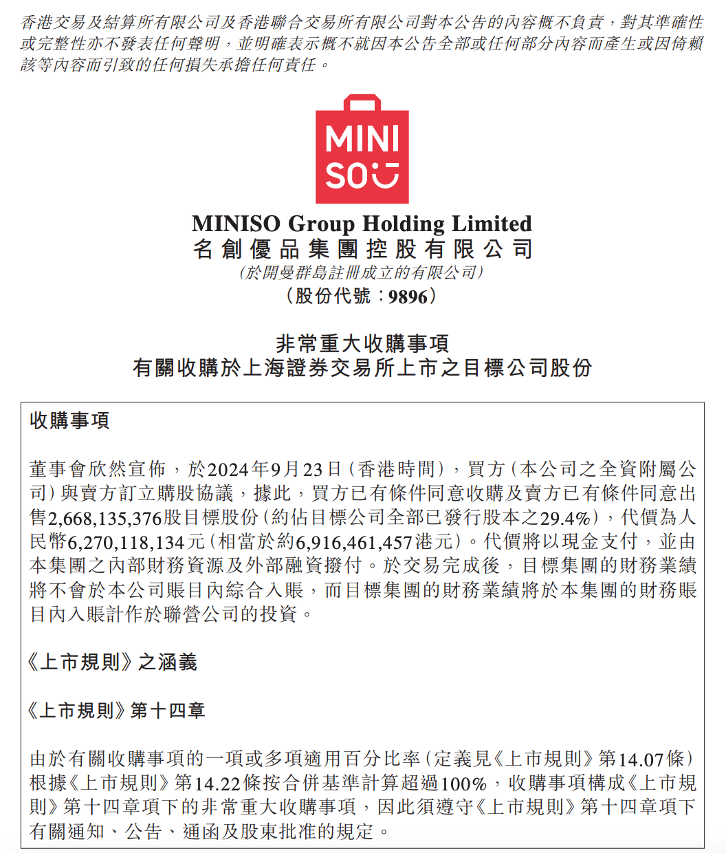 9月23日晚,永輝超市發(fā)布公告,公司股東牛奶公司、京東世貿和宿遷涵邦將轉讓所持股份給俊才國際,交易對價為 62.39 億元。交易完成后,俊才國際將持股 29.4%?〔艊H的實控方為名創(chuàng)優(yōu)品,這意味著,名創(chuàng)優(yōu)品將成永輝超市第一大股東。
