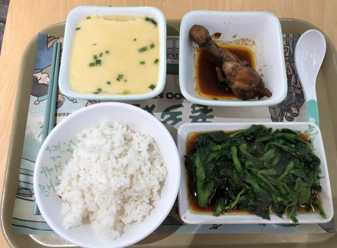 點(diǎn)了一個(gè)18.9元的套餐,內(nèi)含有一份米飯、一個(gè)蒸蛋、一個(gè)雞腿、一個(gè)青菜。