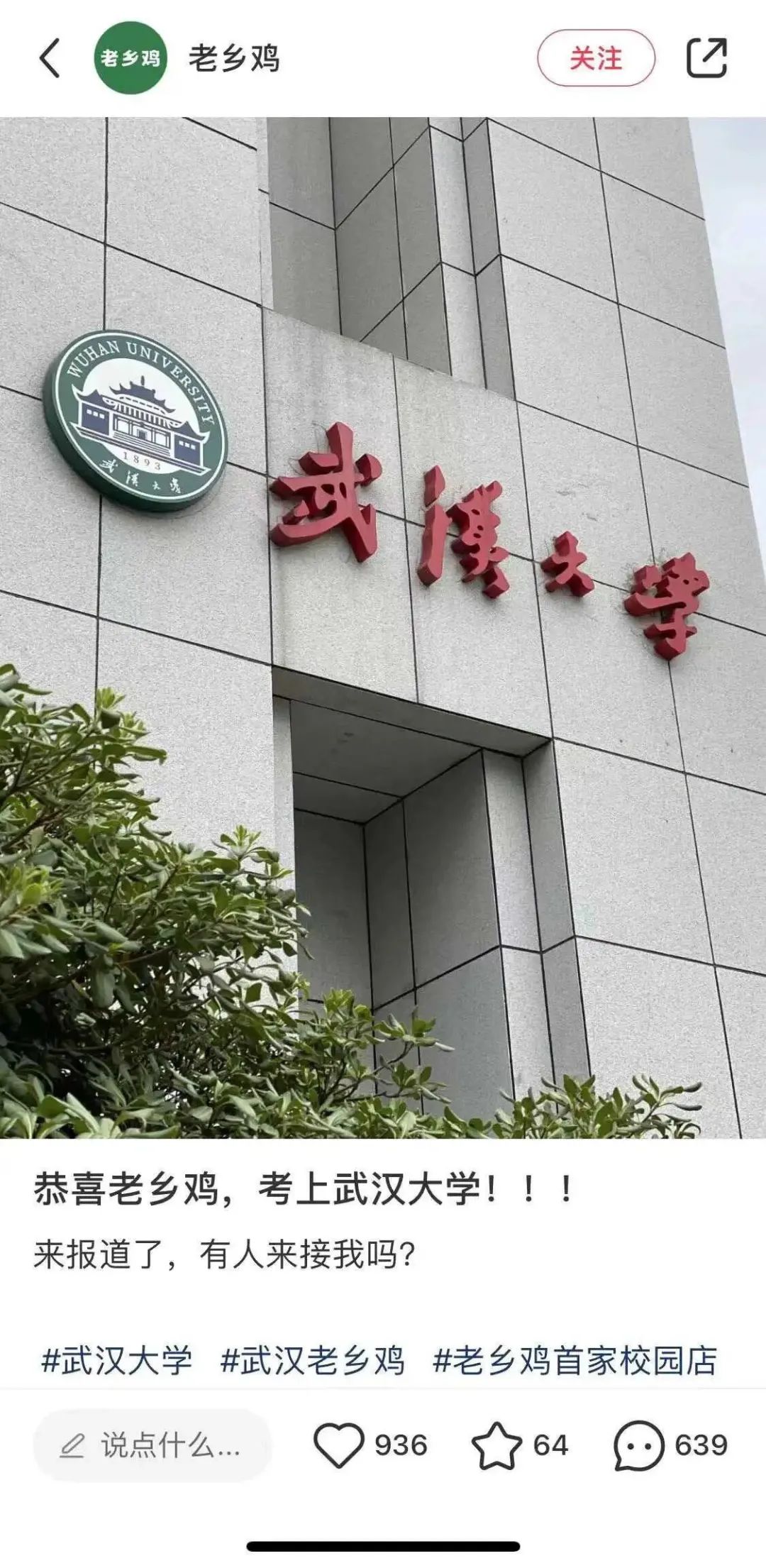 “恭喜老鄉(xiāng)雞,‘考’上武漢大學(xué)!”