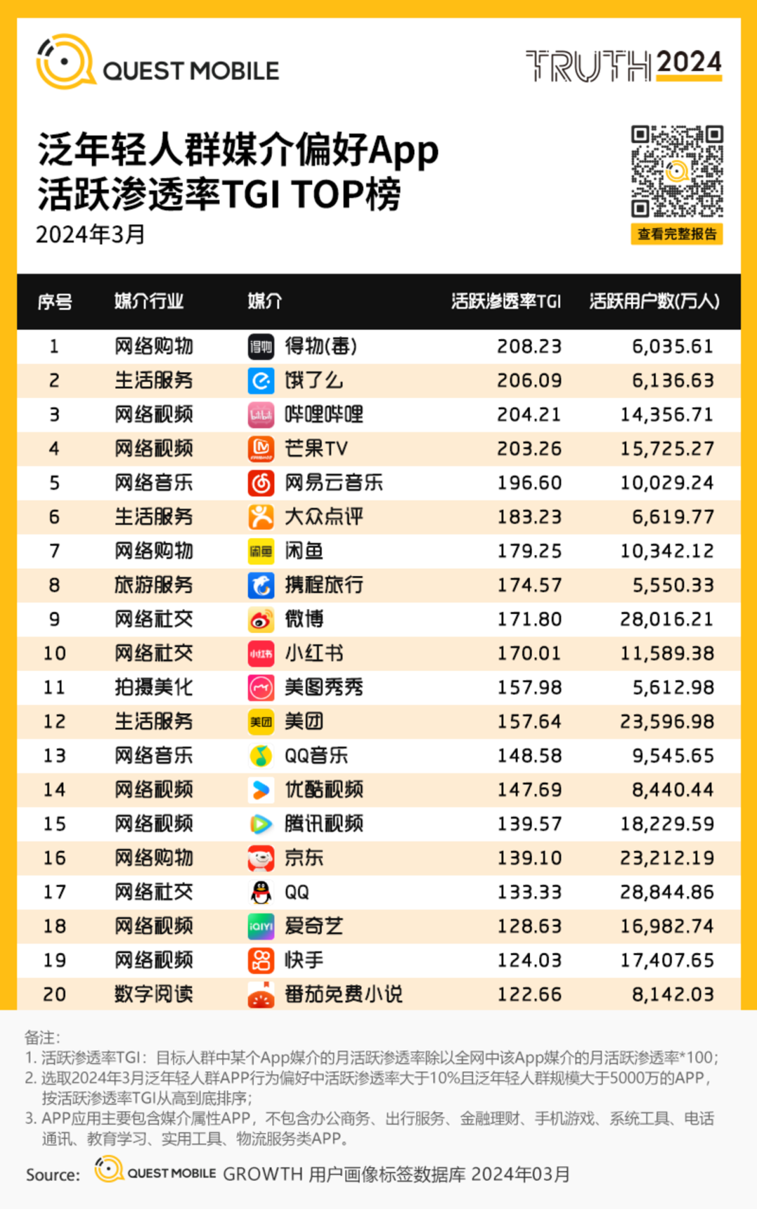 得物的社區(qū)屬性進一步放大了這種潮流效應。用戶不僅在得物購買商品,更通過平臺分享、討論和展示他們的潮流單品,強化了商品作為身份象征和潮流符號的地位。QuestMobile發(fā)布的報告顯示,得物在“泛年輕人媒介偏好App活躍滲透率TGI榜單”中位列第一,平臺滲透率高達70%。