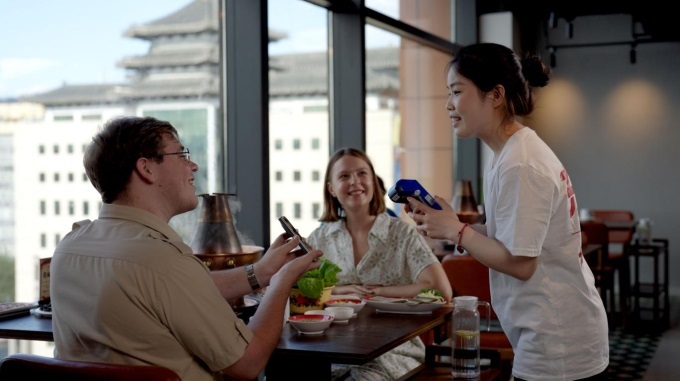 Sophia驚喜地發(fā)現(xiàn),商圈內(nèi)支持信用卡、現(xiàn)金、移動支付等多種支付方式。服務(wù)人員也非常熱情,有的服務(wù)人員能進行英文交流,為其提供有效的指引。在北京市百貨大樓服務(wù)人員的幫助下,她還注冊了微信,試用了微信支付。