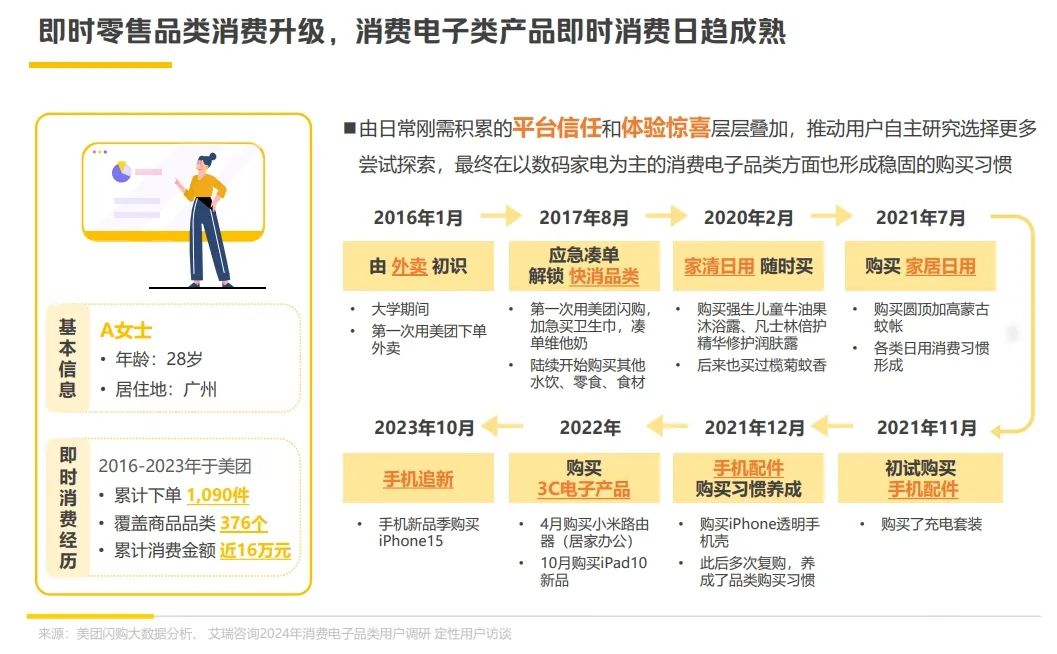 白皮書中提到了一位28歲的廣州消費(fèi)者,近些年來的外賣行為習(xí)慣。2016年,其第一次使用外賣,后因應(yīng)急需要,拓展到快消品類,并成為生活習(xí)慣;2021年,初次嘗試購買手機(jī)配件,并持續(xù)復(fù)購,最終拓展到路由器、iPad、手機(jī)新品。