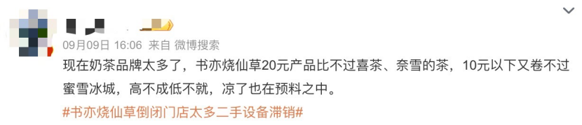 正如一位網(wǎng)友所說的,“現(xiàn)在奶茶品牌太多了,書亦燒仙草20元產(chǎn)品比不過喜茶、奈雪的茶,10元以下又卷不過蜜雪冰城,高不成低不就,涼了也在預(yù)料之中!