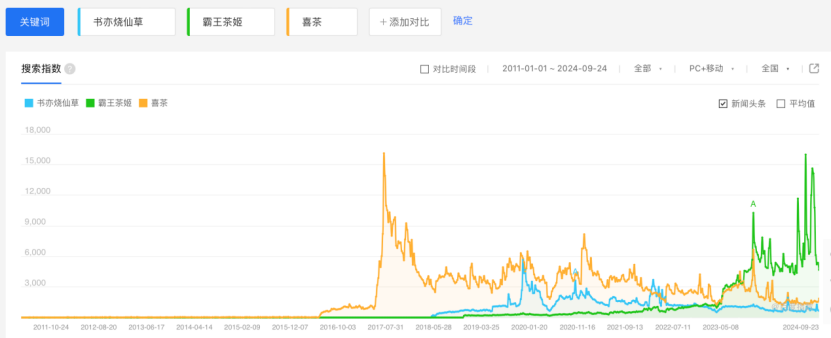書亦燒仙草成立于2007年,喜茶成立于2012年,奈雪的茶成立于2015年。而霸王茶姬,可謂姍姍來遲,到2017年才成立,真正爆發(fā)則要數(shù)2023年。