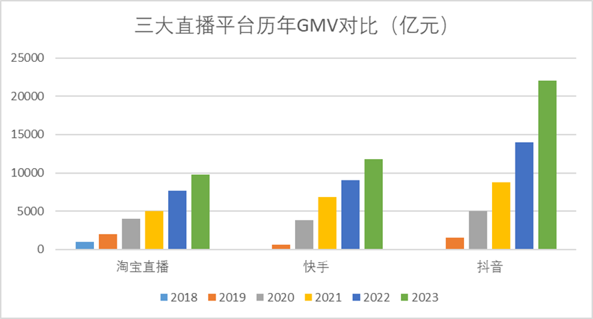 從2018年就開始運營的淘寶直播,直到2023年GMV仍未達(dá)萬億,不及抖音直播的一半,甚至被快手落下了一個身位。