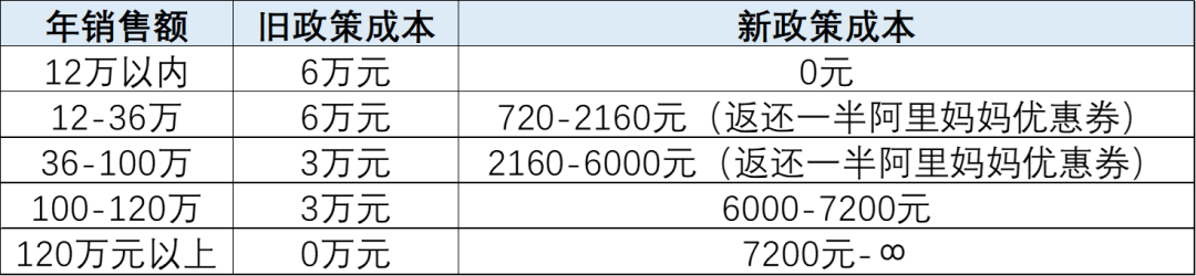 新規(guī)看似絕對成本較低,但以50元件單價計算,月銷只要達(dá)到2000+的店鋪所負(fù)擔(dān)的技術(shù)服務(wù)費成本,就要大于之前的年費成本,而且賣的越多成本越高。