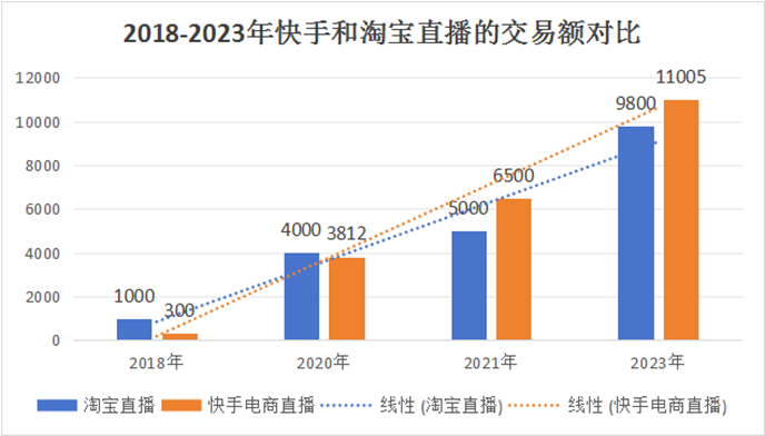 圖:快手與淘寶直播交易額比較(2018-2023),來源:公司財報、錦緞研究院